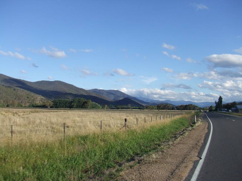 Eerst nog even stress, omdat we geen tankstation konden vinden; die zijn er niet al te veel. Onze slurpbak heeft maar een tank van 50 liter, dus we moeten het wel in de gaten houden. De auto is niet zuinig, maar daar staat tegenover dat de benzine heel goedkoop is, omgerekend Euro 0,50 per liter. Dan gooi je ‘m nog eens vol. Onderweg heel wisselend weer gehad: spetters, stortbuien, hagel en zon. Buien zijn vaak kort en hevig. Het landschap is heuvelachtig en groen met veel koeien. Je krijgt zo een goed gevoel voor de uitgestrektheid van het land; het duurt soms enorm lang voordat je weer door een plaatsje komt (soms niet meer dan een paar boerderijen). Inmiddels zijn we de bergen in gereden en zitten we in Bright bij Mount Buffalo National Park. De hoogste berg is zo’n 1780 meter; het is hier dan ook wat frisser, maar wel prachtig groen. De (denne)bomen zijn hier zo groot, dat er borden staan: beware of large pine apples falling down. In het schattige plaatsje net heerlijk gegeten. ’s Winters kun je hier skiën (veel skiverhuur gezien), ’s zomers andere buitenactiviteiten doen. Dat gaan we morgen bekijken.
