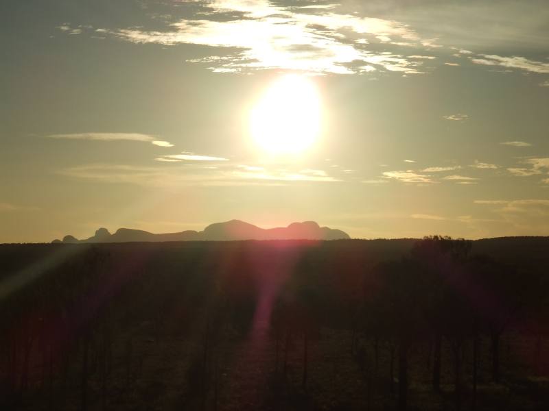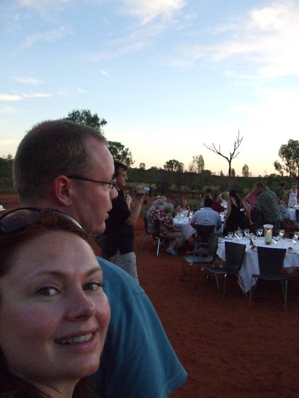 (we komen slaap tekort, door al die vroege uitstapjes). Om 18.00 uur werden we met de bus bij het hotel opgehaald voor de Sounds of Silence (http://www.ayersrockresort.com.au/sounds-of-silence/). Met zo’n 100 man werden we naar een openlucht restaurant in de woestijn gereden. Daar onder het genot van een glaasje champagne vanaf een zandduin de zonsondergang bekeken. We konden zowel Uluru als de Olgas zien. Daarna aan tafel; er stonden ronde acht persoons tafels gedekt, compleet met tafellinnen. Wij zaten bij een Zweeds gezin en twee vriendinnen