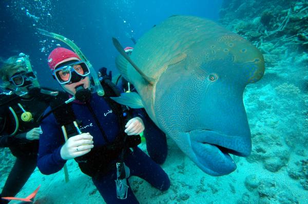 en veel vissen, waaronder Wally, een hele grote zachtblauwe vis met een groene Maori tekening. Deze kon je ook aaien. Onderwater werden foto’s gemaakt, die je uiteraard achteraf kunt kopen. Daarna gedoken, wij met nog 2 mensen en een instructeur. Eerst moest je wat basale oefeningen doen (oren klaren, masker legen en respirator leegblazen).