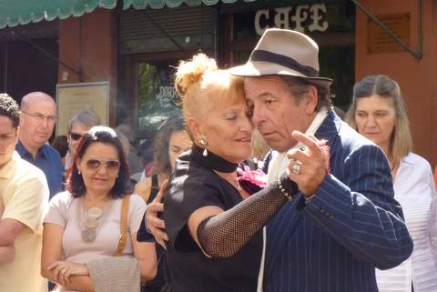 gerenoveerde pakhuizen staan. Daarna naar San Telmo, waar op zondag een antiekmarkt is, compleet met tangodansen op straat. Enorm druk en toeristisch, maar wel gezellig; een beetje als Montmartre. Geluncht in een tentje aan het centrale plein achter een frans balkon, dus toch een beetje buiten. Daarna naar La Boca, waar gekleurde gevels staan en veel straatartiesten de toeristen vermaken. Eind van de middag even chillen in de hotelkamer, daarna gegeten bij een restaurant tegenover ons hotel. Heerlijke eerste dag, 23 graden en de hele dag buiten.
