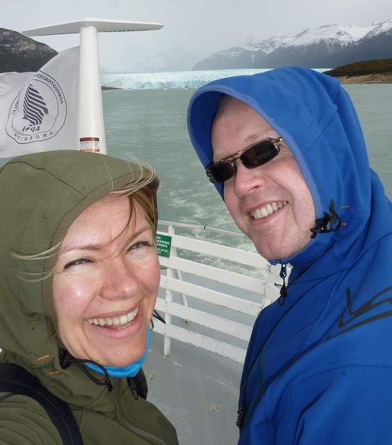 Om 10 voor 7 vanochtend ging opeens de telefoon op de hotelkamer; we worden een uur eerder opgehaald voor onze dagtour naar de gletsjer Perito Moreno. Dus direct op en snel ontbijten. We werden opgepikt bij het hotel, samen met Angela en Adam uit Australië, die nu al 9 maanden op reis zijn. Even tips gevraagd uiteraard. Na 1,5 uur rijden pakten we een boot naar de gletsjer.