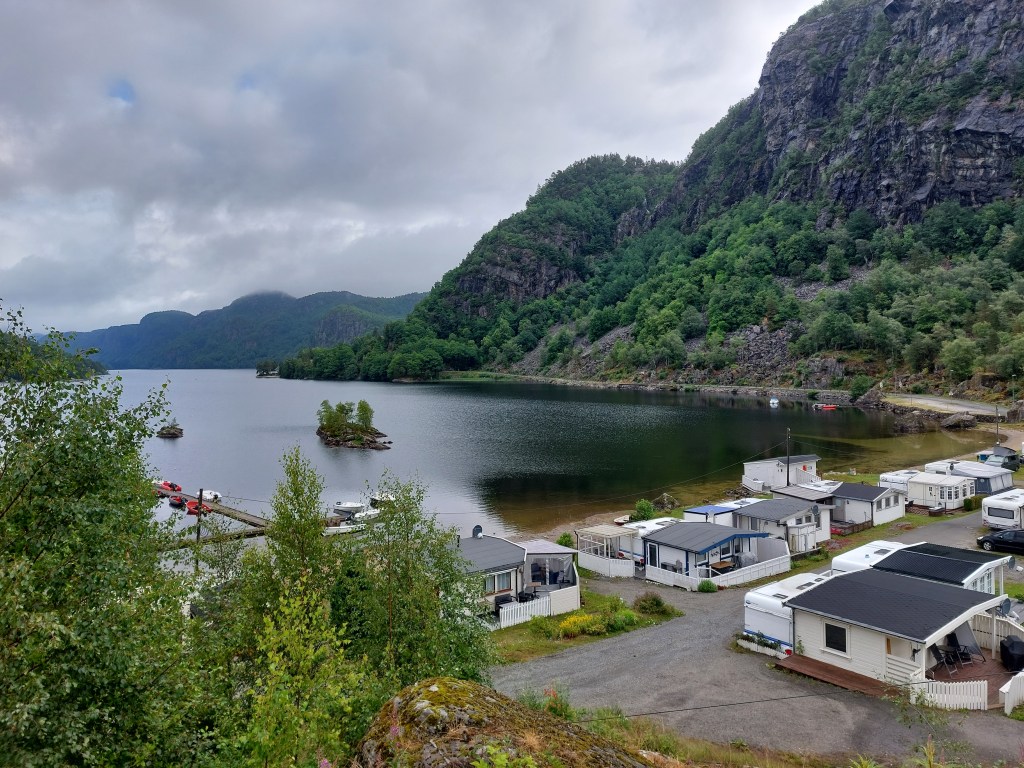 We rijden naar Flekkefjord en bekijken het wijkje Hollenderbyen met witte houten huisjes. Dit is genoemd naar Nederlanders die hier ooit handel dreven, hun schepen lagen in de baai. We pakken de coastal road, een soort provinciale weg, die door de heuvels gaat. Met haarspeldbochten, bijzondere rotsformaties en veel watervallen, na al die regen. We stoppen bij een meertje om te lunchen. Prachtig hier. Verderop ligt Jossingfjord, waar we Helleren bekijken, twee houten huizen die in een uitsparing van een enorme rots gebouwd zijn. Leuk kijkje.