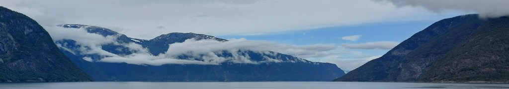 We hadden de wekker gezet, want we pakken vanmorgen om 9 uur de ferry vanaf Gudvangen, even verderop. Speciaal vroeg gepland, omdat in de ochtend droog weer voorspeld is. De ferry gaat door Naeroyfjord, het smalste fjord van Noorwegen. Veel mensen nemen hier een rondvaartboot. Wij nemen de bus mee, dus overtocht en sightseeing in 1. Het is een kleine boot en niet vol. We staan steeds op het bovendek, waar een bandje in 3 talen af en toe wordt gedraaid met uitleg. Prachtige tocht van 2,5 uur.