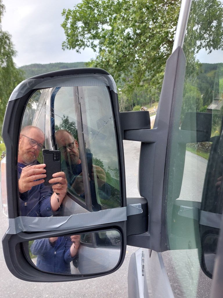 Aan de overkant nog even schrikken; net als we de boot afrijden komt een tegenligger, een Duitse camper, veel te hard en te wijd door de bocht, waarschijnlijk om de boot te halen. Hij tikt onze spiegel aan. Beide stoppen. De behuizing van onze spiegel is heel, maar de spiegel zelf is eruit. Gelukkig weer erin te klikken, de elektrische bediening doet het nog, maar we hebben wel wat barsten. Met plakband en duct-tape gemaakt. We hebben het zo gelaten, want bewijs maar eens wie er schuld had. Met een sisser afgelopen.