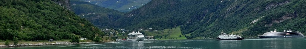 Na nog wat boodschappen gaan we op weg naar Geiranger. Onderweg vinden we een lunchplek met picknicktafel aan een meer. De weg klimt behoorlijk, al snel rijden we in een heel ander landschap. Laaghangende wolken, kale rotsen (boven de boomgrens), een meer met ijsschotsen en veel patches sneeuw. Het is hier ook fris, met 11 graden. Na de pas dalen we snel, met veel haarspeldbochten. Hier is er ook af en toe file, want Geiranger is de grootste fjord-attractie van Noorwegen. Naast de campers en auto’s, ook veel tourbussen op deze drukke weg. Iedereen houdt goed rekening met elkaar, door ruimte te maken om een ander door te laten. In het miniplaatsje Geiranger liggen maar liefst 3 cruiseschepen. Onze camping zit iets voorbij de drukte aan het fjord.