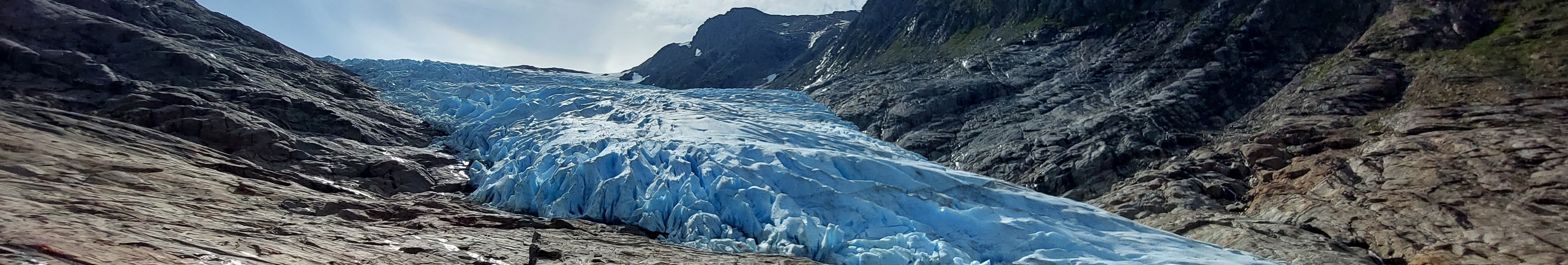 Lang leve de Noorse weerapp, want die heeft het vaak goed. Super helder weer vandaag. We schieten een beetje op, want we willen om 10 uur de shuttle boot halen naar Svartisen gletsjer. Het is maar een klein bootje (40 man). Bij de parkeerplaats is het al heel druk. Eigenlijk wilden we de fietsen meenemen, maar gezien de rij bij de boot haasten we ons zonder fietsen. En dat was maar goed ook, want wij kunnen nog mee, maar er zijn mensen die er niet meer op pasten en dus een uur moeten wachten. Dan lopen we het eerste vlakke stuk wel, i.p.v. fietsen. Door de haast hebben we een beetje weinig proviand mee. Dat wordt hiken op bananen, dadels en een paar koeken. Gelukkig is er aan de voet van het gletsjermeer een restaurant, voor na afloop.