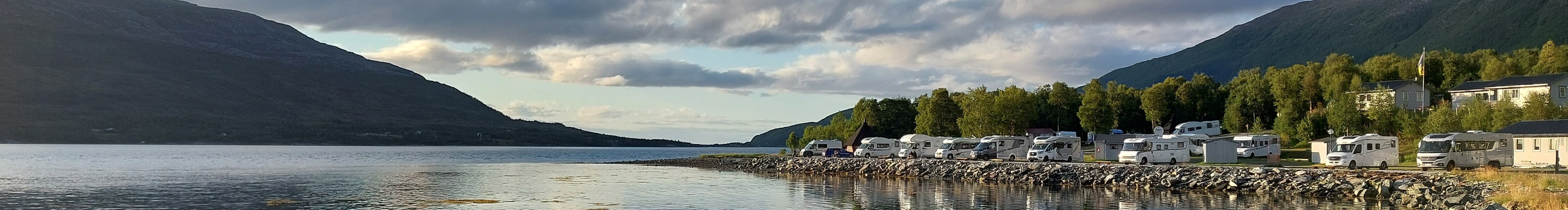 Omdat het zo voorspoedig verloopt besluiten we iets verder te rijden dan gepland. Bij Storslett vinden we een camping vlak aan het water. Met een zonnetje erbij is 14 graden net warm genoeg om buiten te zitten. We doen een wasje en struinen wat rond op de camping. We staan als eerste aan de waterkant, maar langzaam vult het rijtje zich met andere kampeerders. Telkens even loeren waar ze vandaan komen. We eten binnen, want het is bewolkt en nu wel fris. Als de zon nog onder de wolken uitkomt gaan we toch nog even buiten kijken. Mooie plek is dit weer.
