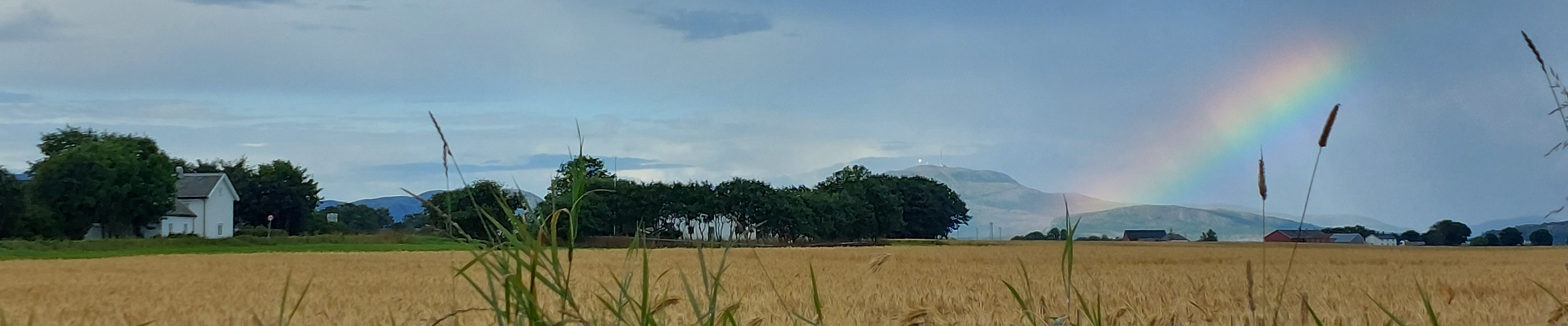 Terug naar de kust. Nog een stukje rijden we op die lange E6, die van Noord naar Zuid loopt. Daarna pakken we een kleinere weg. We rijden langs talloze meren en meertjes. Er is weinig verkeer hier en er zijn nauwelijks campers. Dit is rustig en landelijk Noorwegen. Minder dramatisch landschap met glooiende heuvels, maar ook weer mooi. Dichter bij de kust zien we ook meer akkerbouw; de vallei wordt breder en en het land vlakker. Velden staan hier vol met graan. Met de gebruikelijke lunch en koffiepauzes en nog wat boodschappen, zijn we in de middag op de camping. Onderweg heeft het af en toe geregend en ook hier spettert het nog wat, maar is er ook een mooie regenboog. Later wordt het droog en zitten we lekker in de zon. Over het graan heen zien we het fjord en de ferry, die we morgen zullen nemen. We lopen nog een stukje om de benen te strekken. Lekker onderwegdagje.